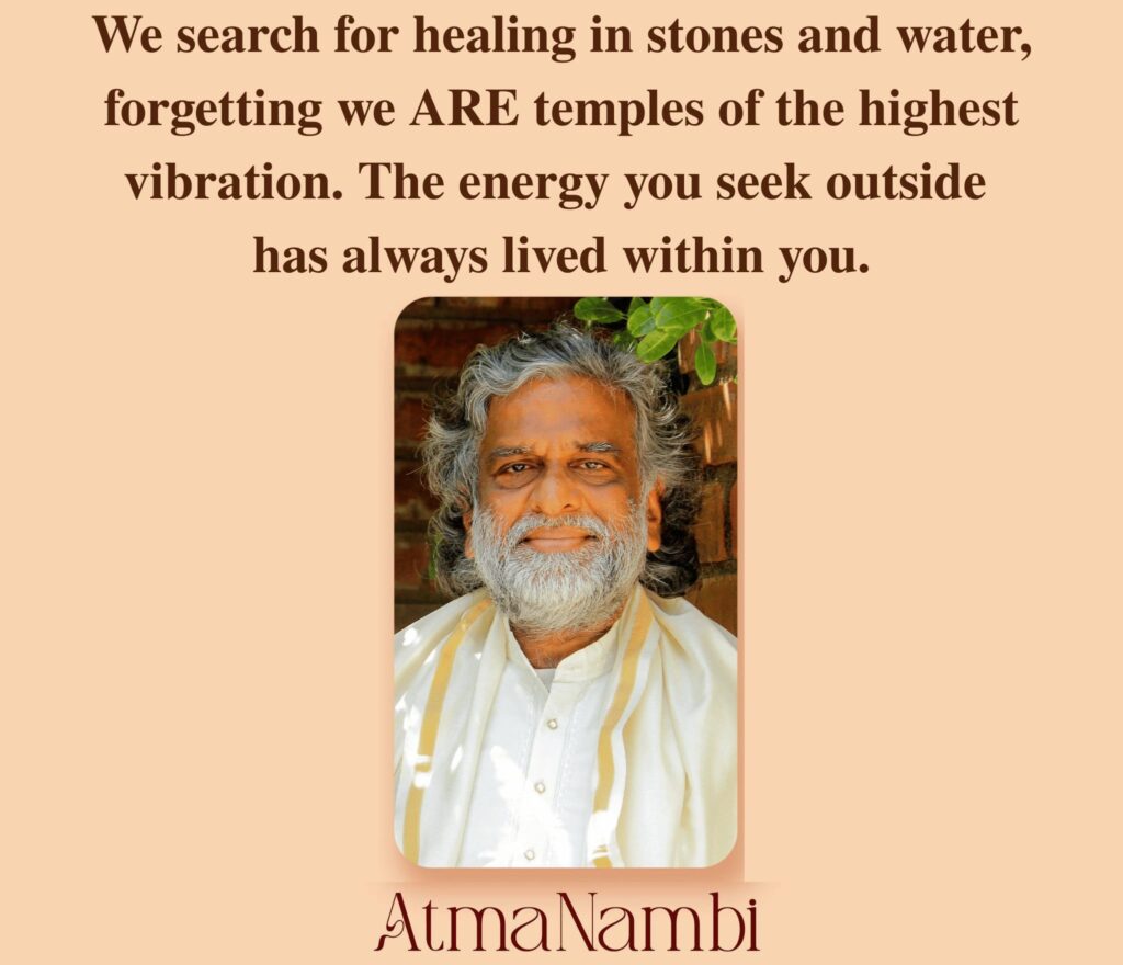 AtmaNambi reveals we are temples of the highest vibration. Stop searching for healing in stones and water—the divine energy you seek outside has always lived within you. Discover inner divinity.