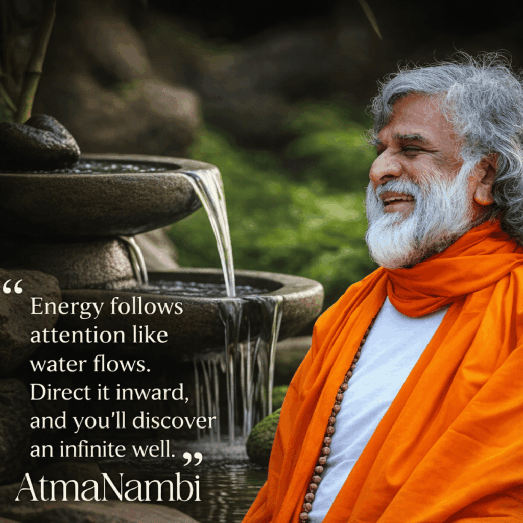Energy follows attention inward like water flows naturally. AtmaNambi teaches how directing your focus within reveals an infinite well of peace, power, and spiritual wisdom waiting to be discovered.