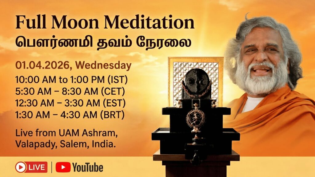Experience the Full Moon Meditation live with AtmaNambi — a sacred 3-hour inner journey broadcast from UAM Ashram, Salem, uniting global seekers in stillness and awakening.