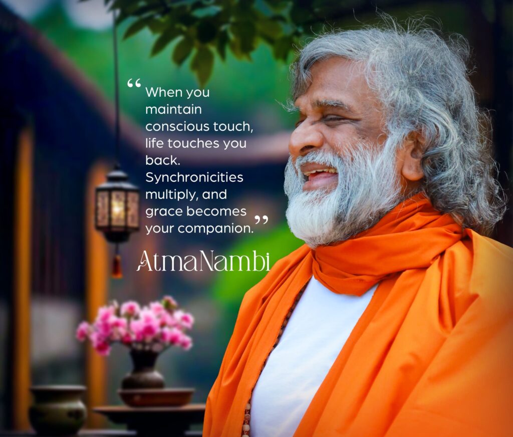 Discover how the power of conscious touch and synchronicity can transform your daily life. Guru AtmaNambi guides you to awaken deep awareness, inviting divine grace to become your constant companion.